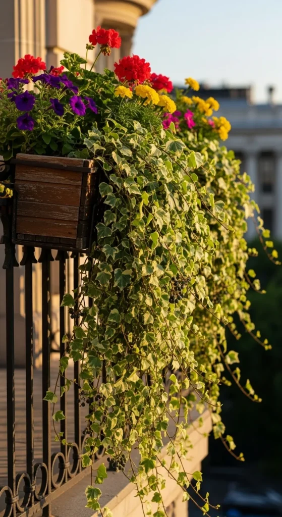 Ivy stays green all winter and softens the edges of a balcony box. Pair it with bold winter blooms like violas or small conifers. Keep growth trimmed so it doesn’t spread too far.