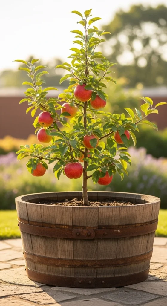 Barrel planters give a farmhouse feeling that suits apple trees perfectly. Drill plenty of drainage holes before planting. Keep the soil airy with compost and perlite. This container holds enough soil volume for steady fruiting.