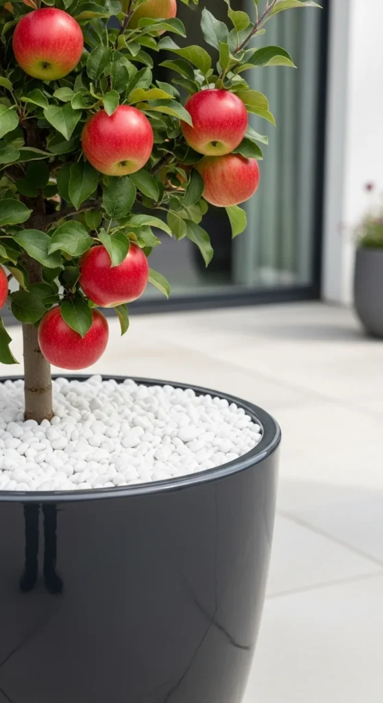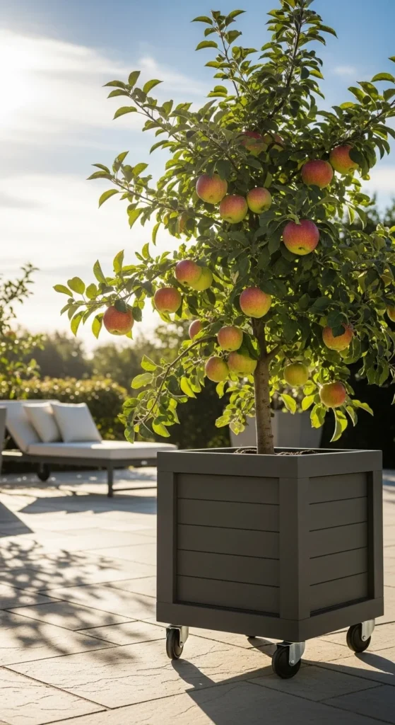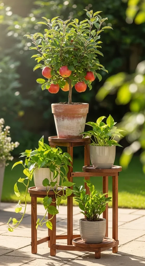 Placing the apple tree on the top tier of a multi-level stand brings it closer to sunlight. Lower levels can hold herbs or flowers. This setup works well on small patios with uneven lighting.