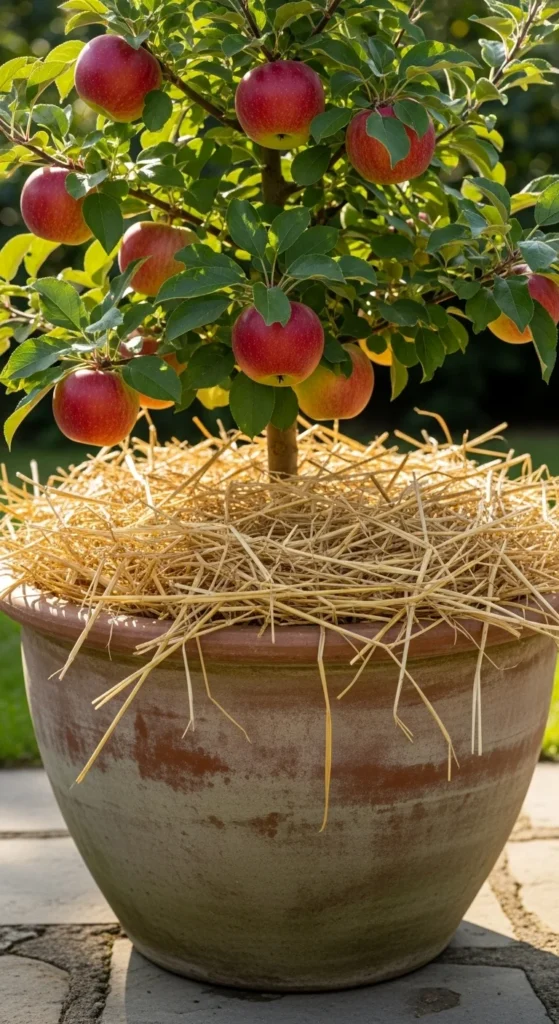 Straw mulch keeps moisture consistent and protects roots from temperature swings. Spread a thin layer so the trunk stays uncovered. Mulch also keeps weeds away and reduces watering frequency.