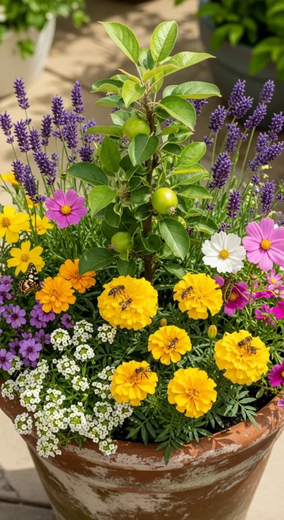 Plant small pollinator-friendly flowers around the pot to attract bees. This helps apple blossoms get proper pollination for better fruiting. Choose low-growing flowers like alyssum or dwarf marigolds.