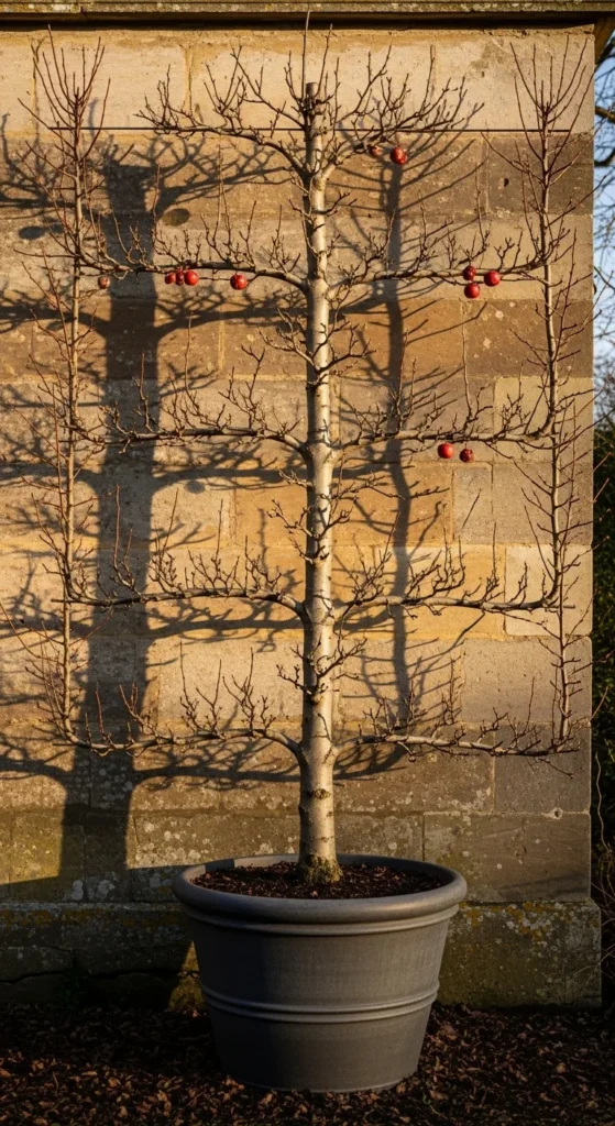 Espalier training saves space and creates a striking pattern. Use a container placed a few inches away from a sunny wall. Guide branches horizontally with soft ties. This structure improves airflow and helps fruit ripen evenly. It’s simple to maintain because branches grow predictably.