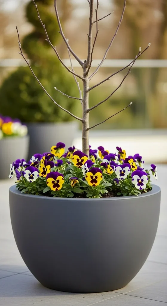 Underplanting adds color without harming the tree. Winter pansies, violas, or small greens fit well around the trunk. Keep an inch of space around the trunk to avoid rot. These plants also help keep soil cooler during warm days.