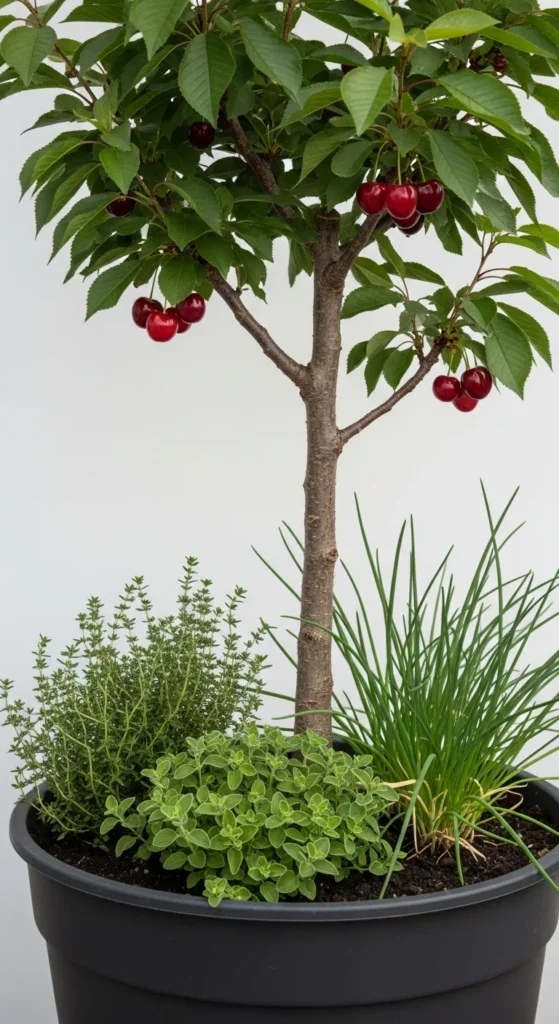 Under-planting makes your container work harder. Choose low herbs like thyme or oregano that won’t compete heavily with the cherry roots. They shade the soil and help reduce evaporation. Add a shallow mulch layer between herb clusters to keep moisture steady. Snip herbs often so they stay compact. Keep fertilizer mild to avoid pushing too much leafy cherry growth. This layered approach looks attractive and keeps the container productive from top to bottom.