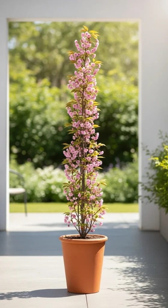 12. Columnar Cherry in a Slim Patio Pot
