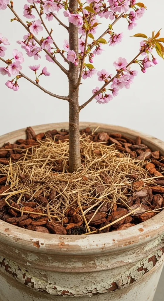 Mulch creates a finished look while stabilizing soil temperature. Use materials like fine bark, cocoa hulls, or straw to match your style. Spread a thin layer so the trunk stays uncovered. Mulch reduces watering frequency and keeps roots comfortable. Choose soft tones that complement the pot’s color. Replace the mulch each season to keep it tidy and pest-free. It’s a small detail, but it makes the entire container feel complete.