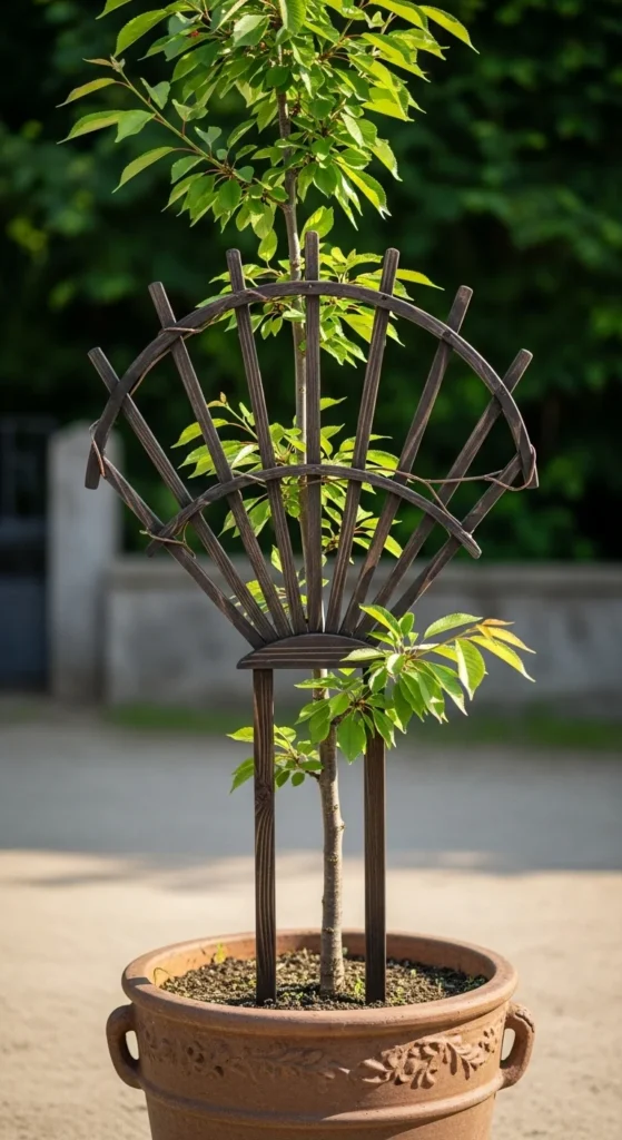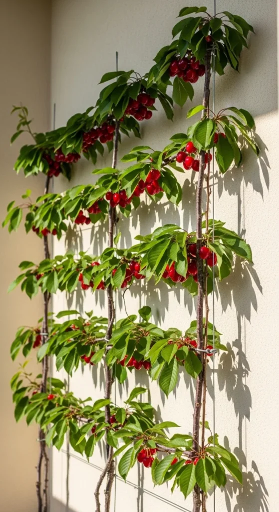Espalier styling saves space by training branches flat. Attach a simple wire grid or wooden trellis to your wall. Plant a compact cherry variety in a container right below it. Tie young branches to the support as they grow. Keep side shoots trimmed so the main arms stay clean. This style creates a living wall without blocking walking space. Water carefully so the soil doesn’t dry too fast near the wall’s heat.