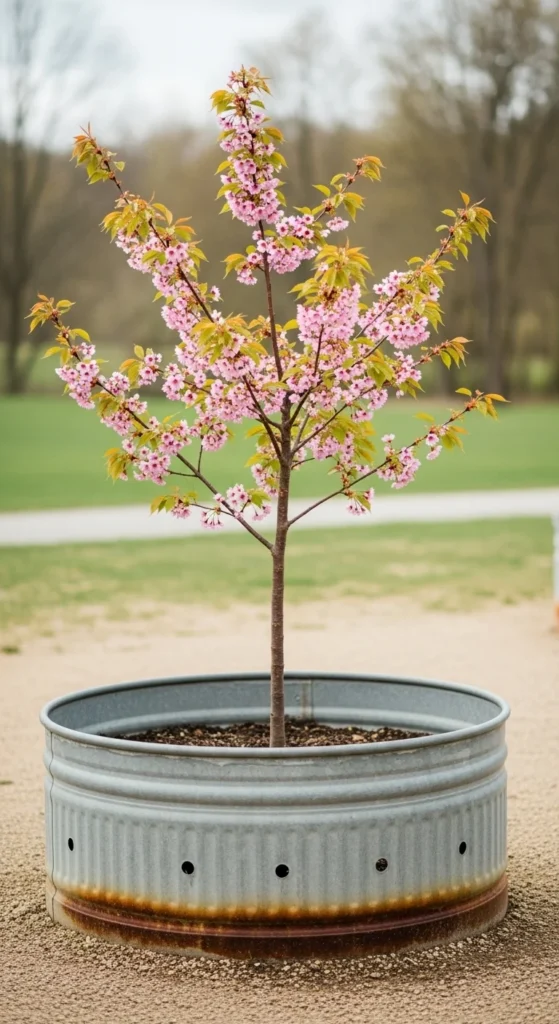 Metal tubs give a farmhouse touch and hold large soil volumes. Drill several drainage holes before planting. Use a mix that drains quickly to prevent waterlogging. Metal can heat up, so position the tub where it gets morning sun and afternoon shade. Add wood blocks underneath to raise airflow. A cherry tree in a metal tub stands out on porches, sheds, or garden corners. Keep watering steady during hot spells to protect roots.
