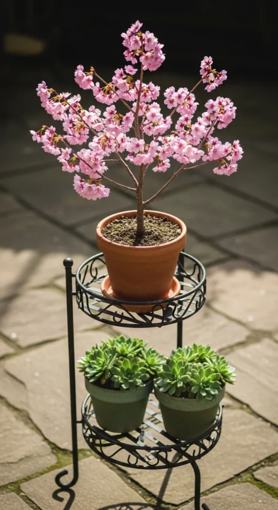 A two-level stand adds height and creates a focal point. Place the cherry tree on the top tier and smaller pots—herbs, flowers, or decorative greens—beneath it. This keeps the tree at eye level and makes harvest easier. Choose a sturdy stand that can hold the weight of a full container. Water slowly so spills don’t flood the lower tier. Keep pruning light to maintain symmetry. This layout suits patios where you want vertical interest without taking more floor room. Add small solar lights around the base for nighttime ambiance.