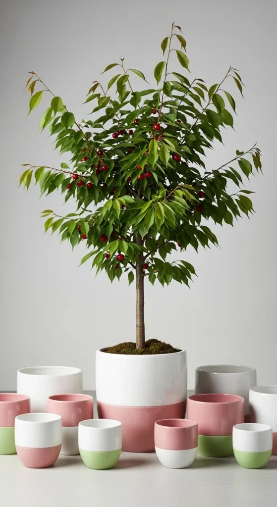 Color-blocking gives containers a cohesive style. Paint your cherry pot and surrounding small containers in the same palette—two or three shades that work together. Place the cherry tree in the center and cluster low plants around it. This frames the tree without overcrowding. Keep the cherry container slightly elevated to highlight its stature. Water the smaller pots carefully so runoff doesn’t wash soil away. This display works well for outdoor seating areas that double as décor.