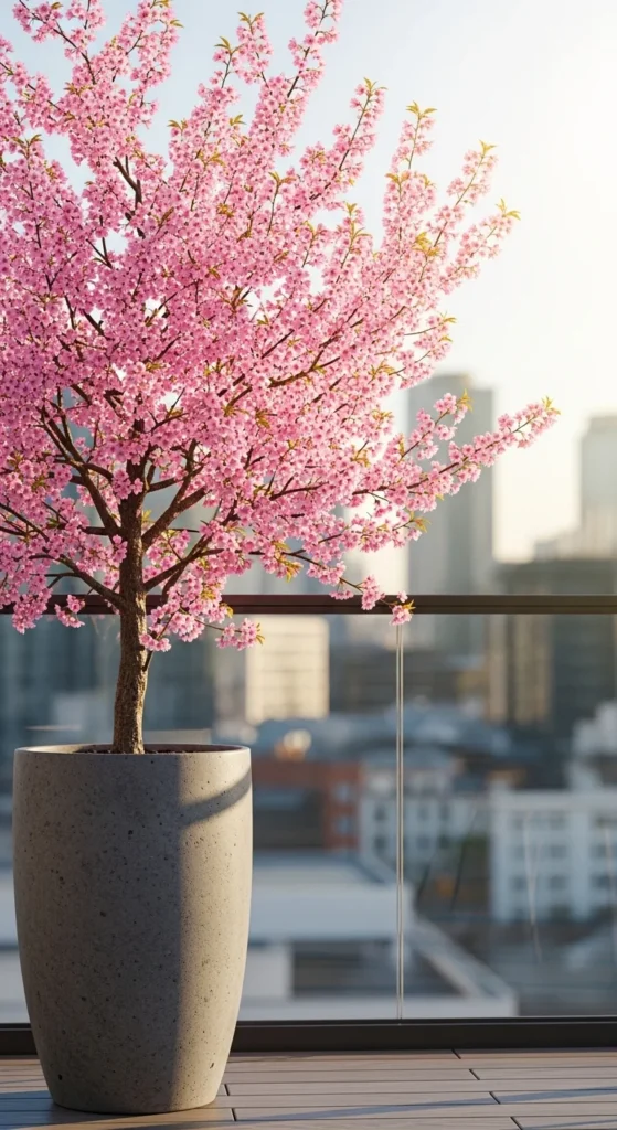 2. Balcony Cherry Tree in a Tall Fiberstone Container