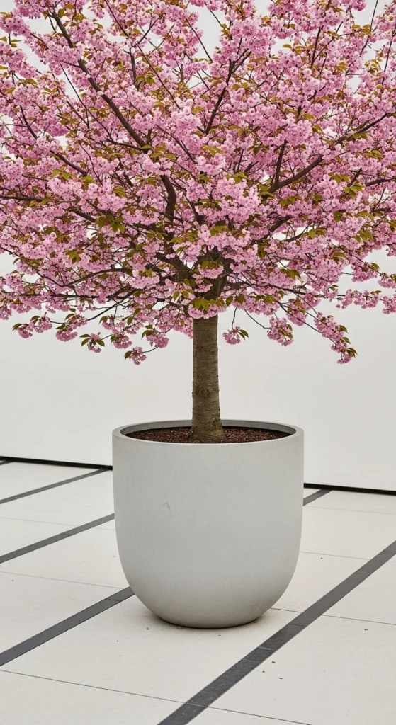 18. Cherry Tree in a Color-Blocked Pot Arrangement
