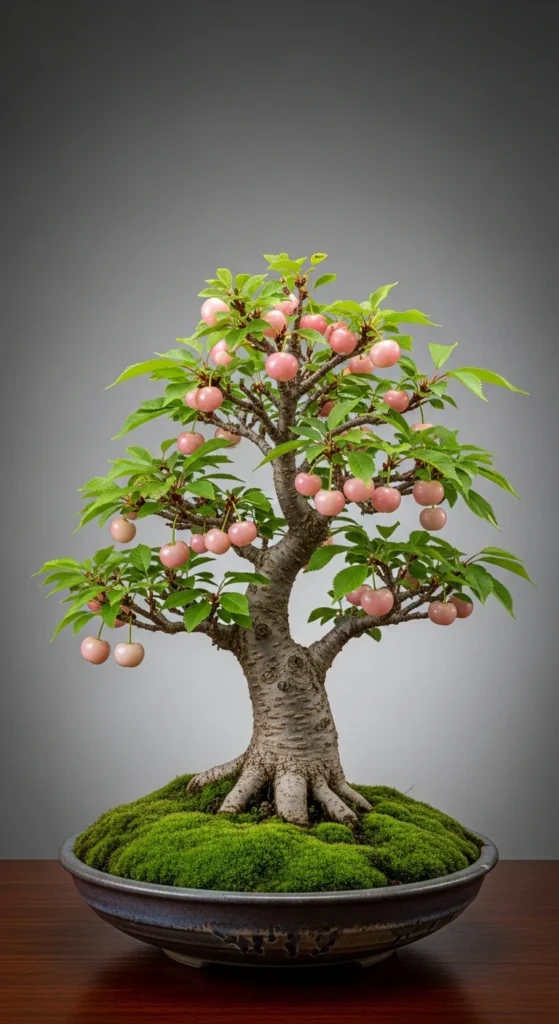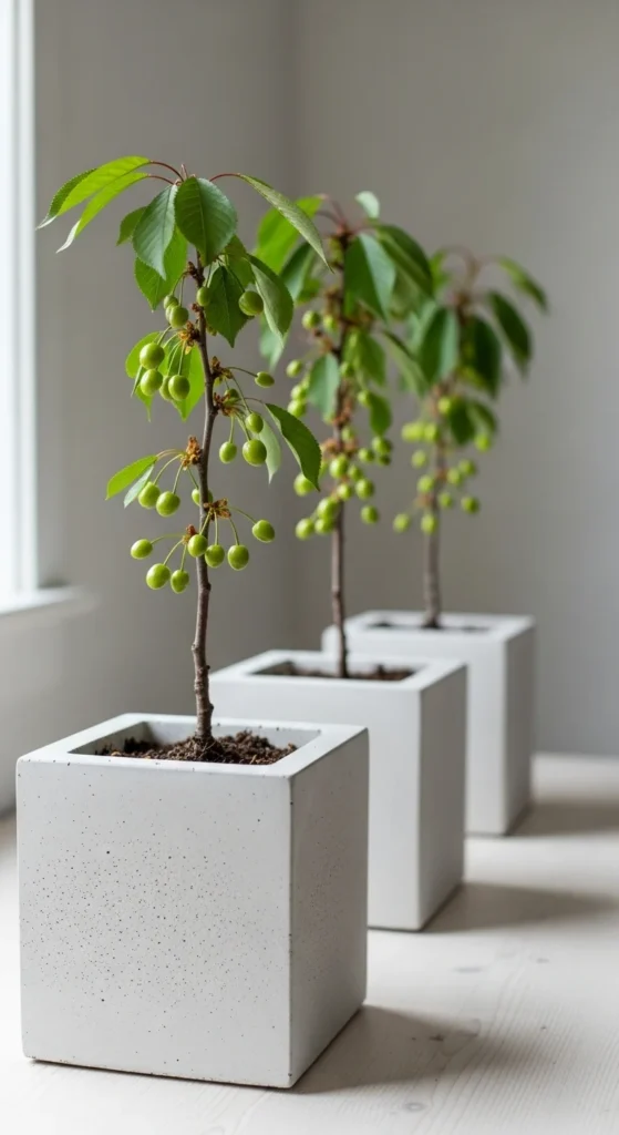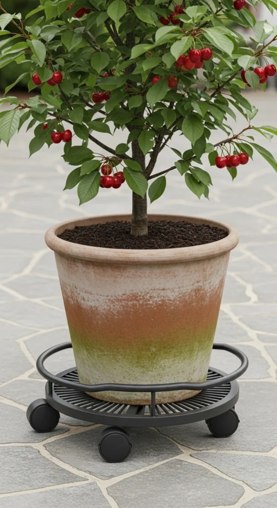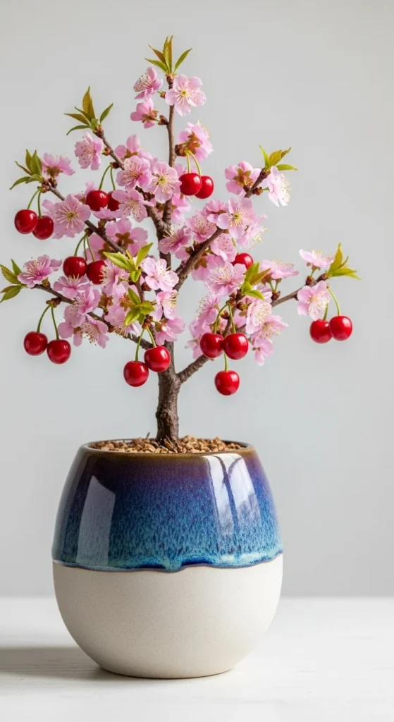 A bonsai-inspired cherry tree creates a sculpted look. Use a wide shallow bowl filled with fast-draining soil. Prune regularly to encourage small leaves and short branches. Add moss along the surface for a soft finish. Keep watering gentle and frequent because shallow bowls dry quickly. Place the bowl in partial sun to protect young twigs. This style suits small tables, entry corners, and low patio shelves. A compact tree also makes harvesting simple and enjoyable.