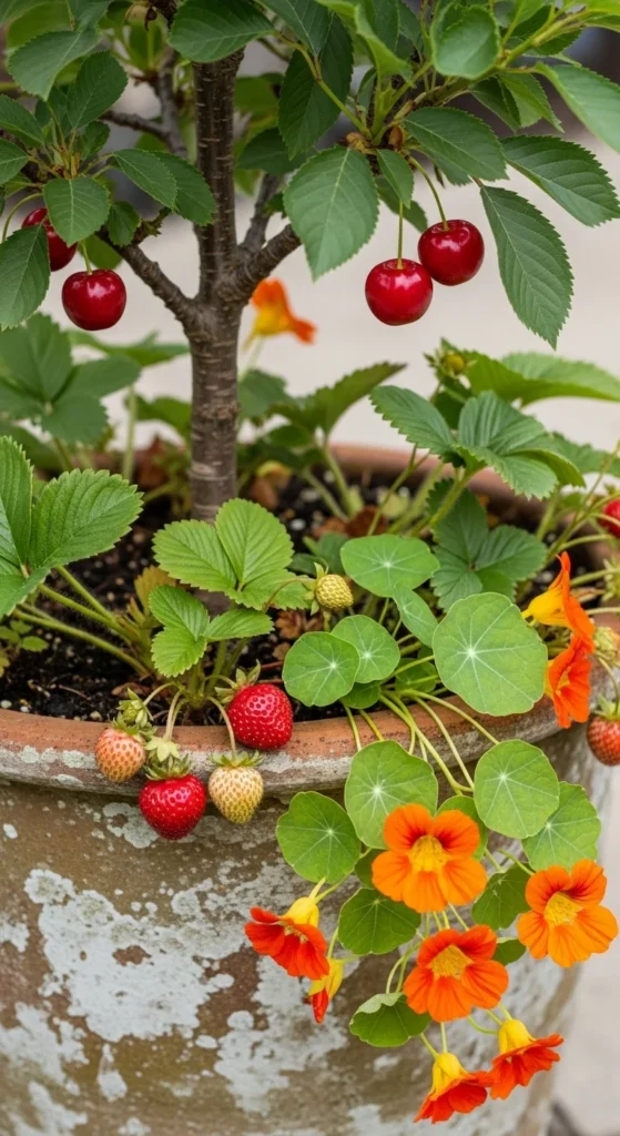 Planting a seasonal ground layer makes your pot look full and productive. Strawberries pair well with cherries because they stay low. Nasturtiums add color and edible petals while trailing softly. Keep the central area near the trunk clear so air flows well. Add compost lightly around the outer ring each month. Water from the top and let excess drain out. This layered style makes your container feel abundant and keeps weeds out naturally.