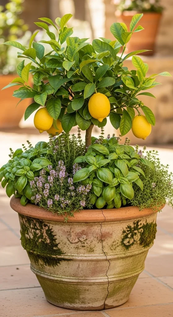 Mix herbs and citrus in one large pot. The herbs protect soil moisture and add fragrance. Choose a lemon tree as the centerpiece with basil or rosemary around the base.