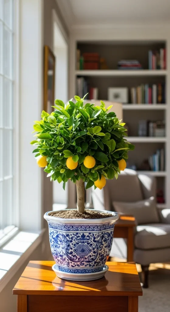 Train your citrus into a neat topiary. Use a single trunk and shape the crown as it grows. Regular pruning keeps it compact and ornamental. It’s perfect for formal interiors.
