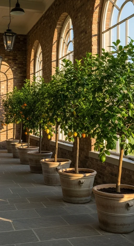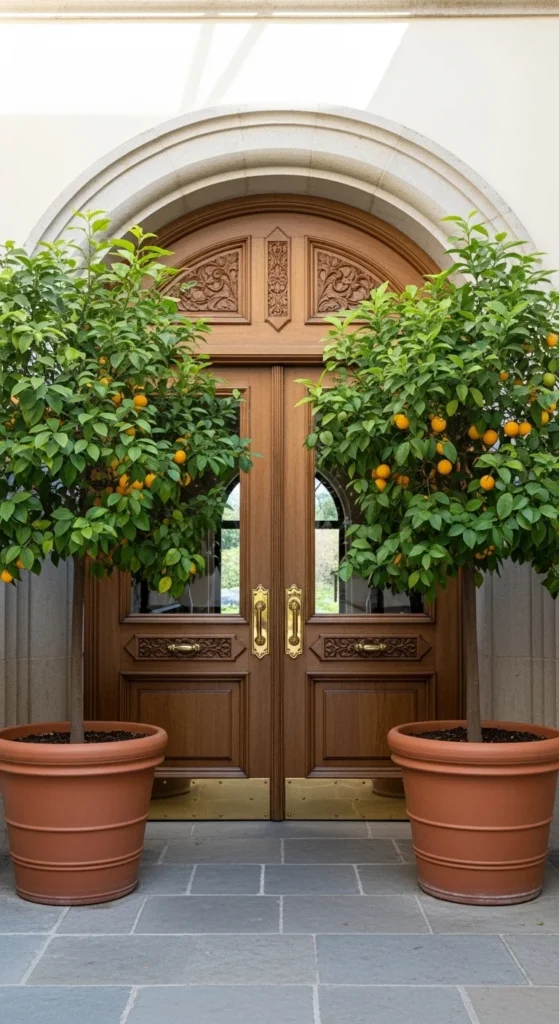 Frame doorways or windows with twin citrus trees for symmetry. Choose compact Meyer Lemons or Calamondins. Matching pots and balanced height give a polished finish.