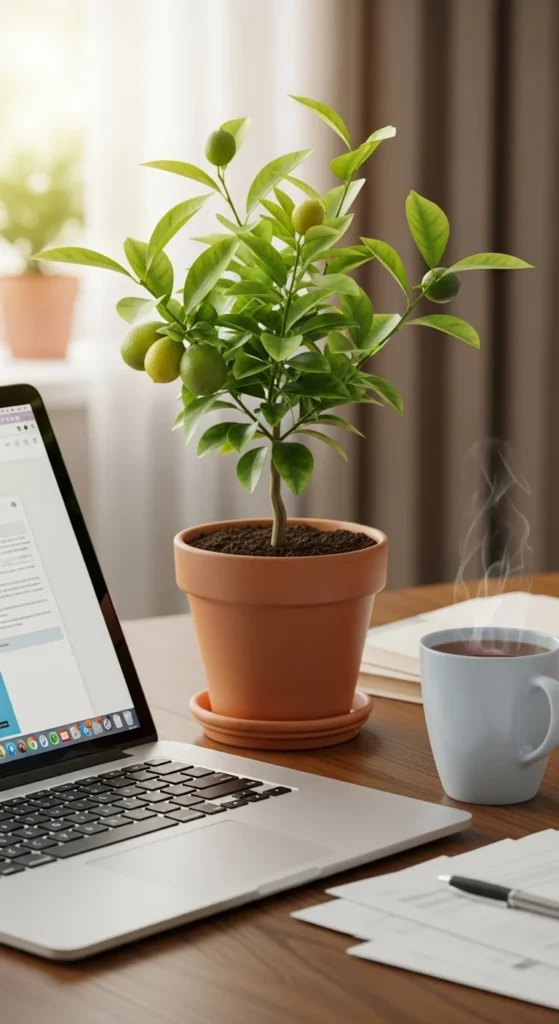 A mini citrus tree adds brightness to any desk. Compact Calamondin or Kaffir Lime varieties are perfect. The scent keeps air fresh and your workspace lively.