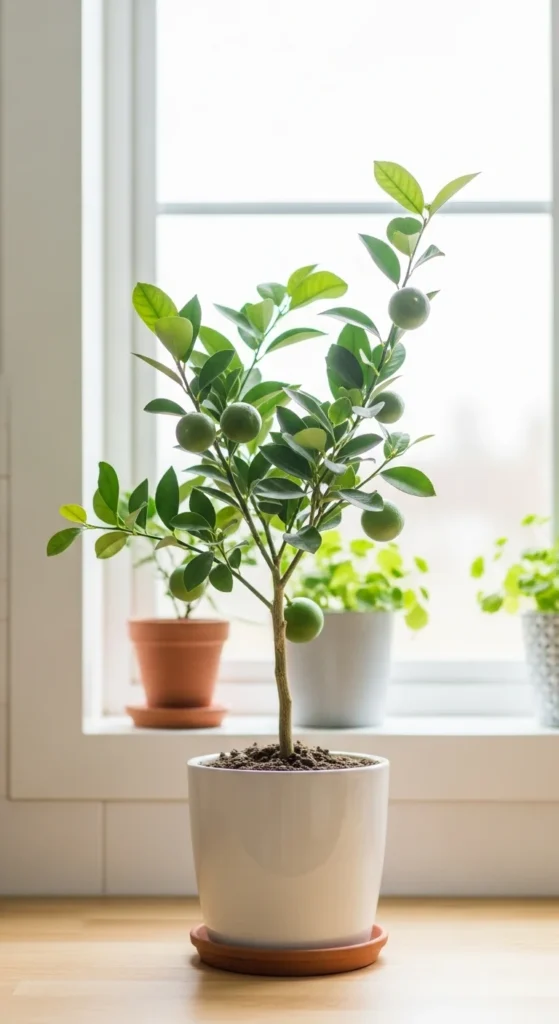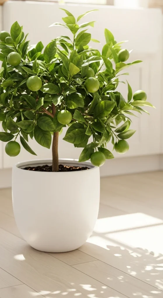 Lime trees love warmth and light, making them ideal for sunny kitchens. Go for Persian or Key Lime varieties. A clean ceramic pot complements minimalist interiors. Keep the soil evenly moist and mist leaves weekly.