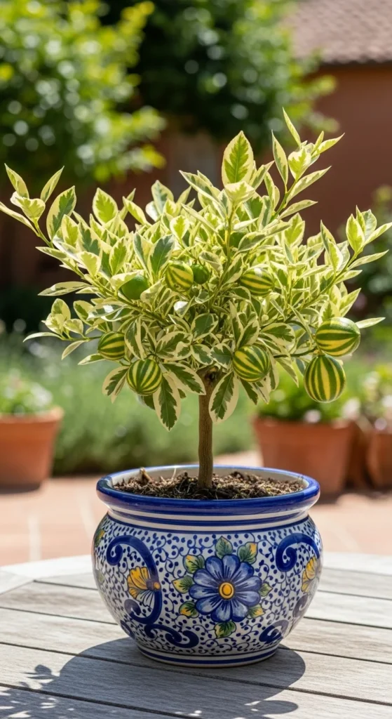 Variegated lemons are eye-catching, with striped leaves and fruit. They thrive in bright light and look beautiful in patterned ceramic pots. Great for decorative corners where color contrast matters.
