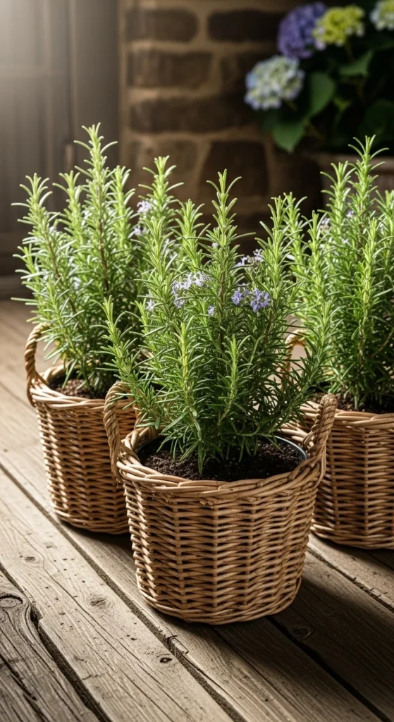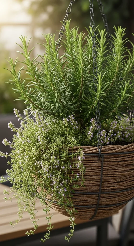 Hanging baskets save space and give rosemary plenty of airflow. Choose a lightweight soil mix and keep water moderate. Rosemary will hold its shape even when placed above eye level.