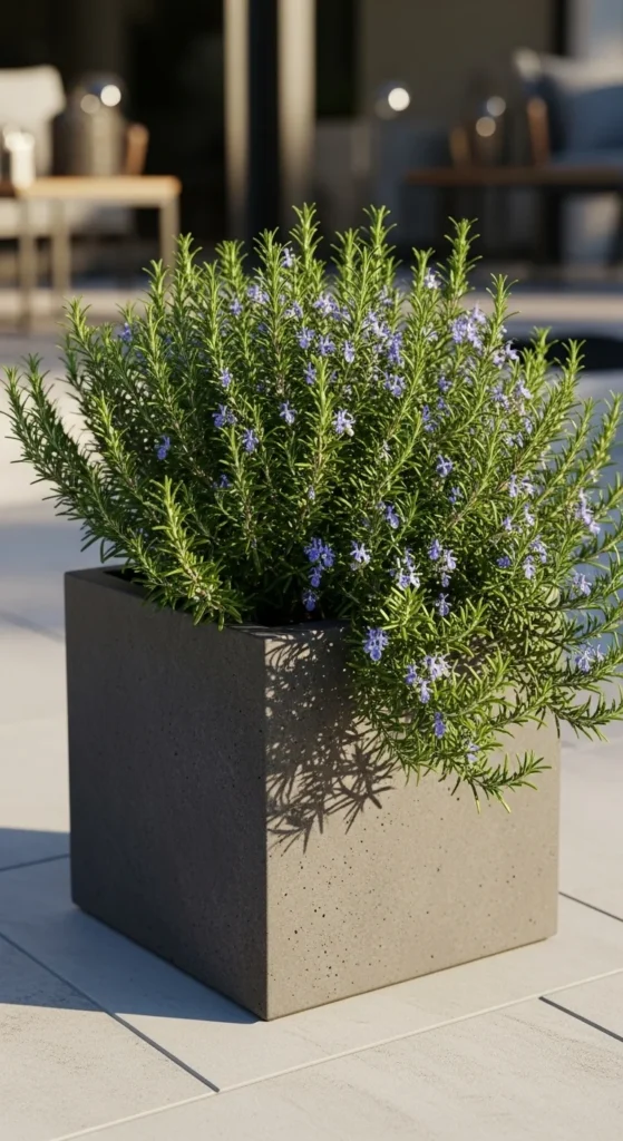 Square planters add structure and fit well against walls. Place one near an outdoor table for easy access. Rosemary grows outward but stays manageable with light trimming.
