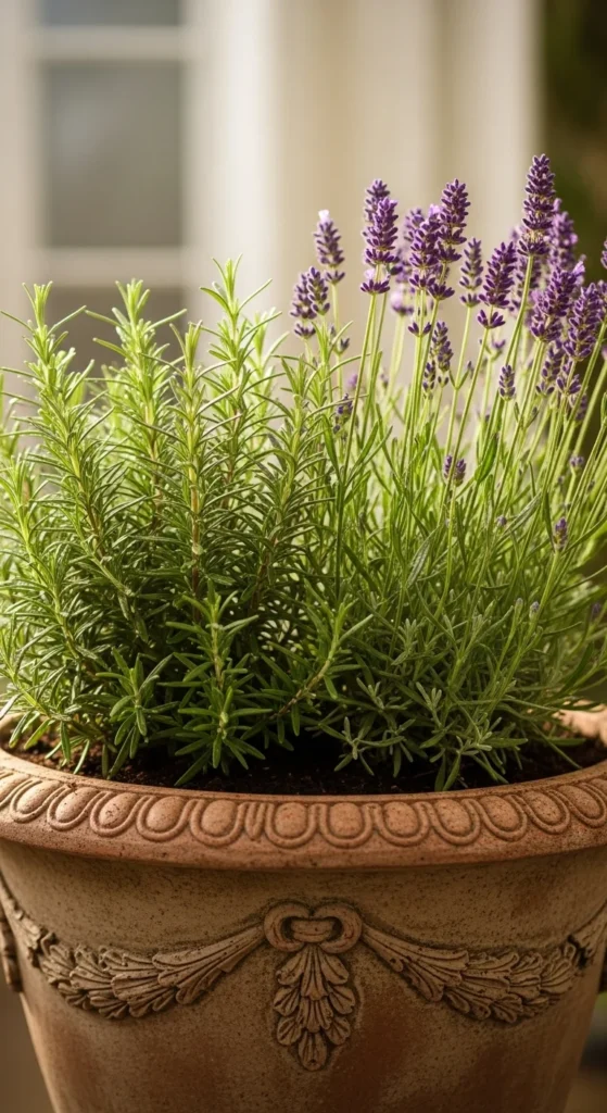 Rosemary and lavender complement each other with scent and shape. Both enjoy similar soil and watering routines. Keep the lavender on the sunnier side of the pot and rosemary on the opposite corner for balance.