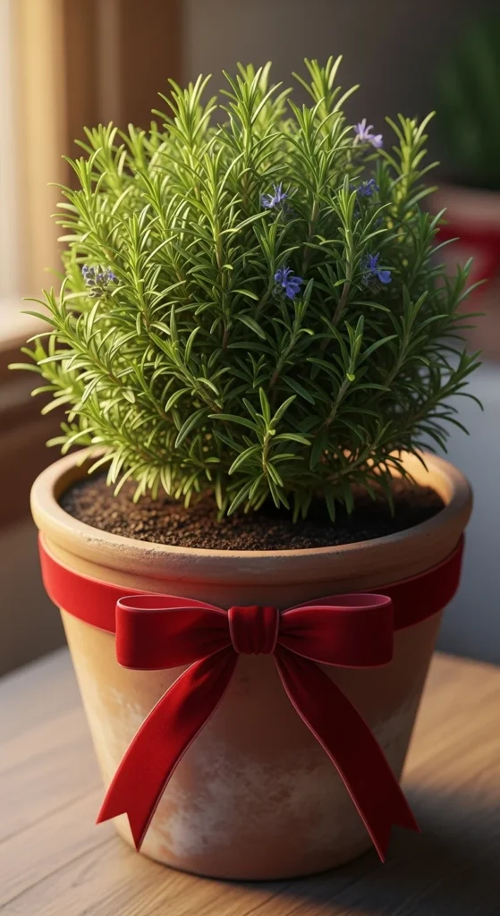 Dress up a rosemary pot with a simple ribbon. This small touch works well for winter gatherings. Keep the ribbon away from the soil and tie it just above the rim. The plant stays natural while still feeling festive.