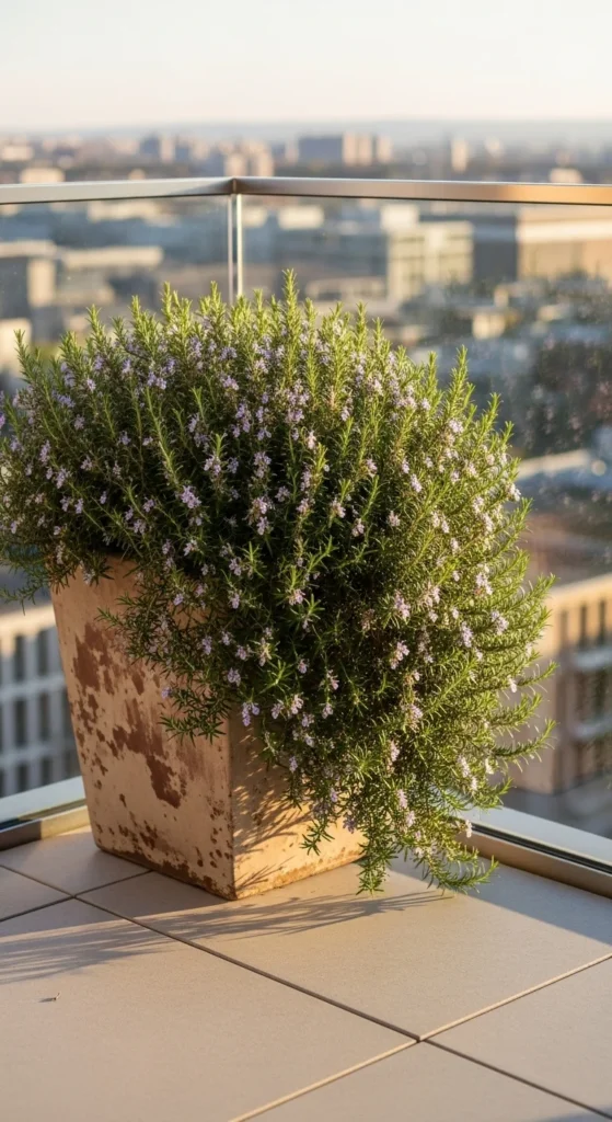 A large rosemary bush fills a balcony corner with shape and fragrance. Use a wide pot with deep drainage. Let the plant grow naturally, trimming only when size needs control. It adds privacy without blocking too much light.