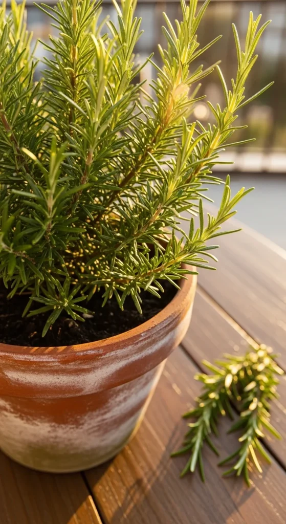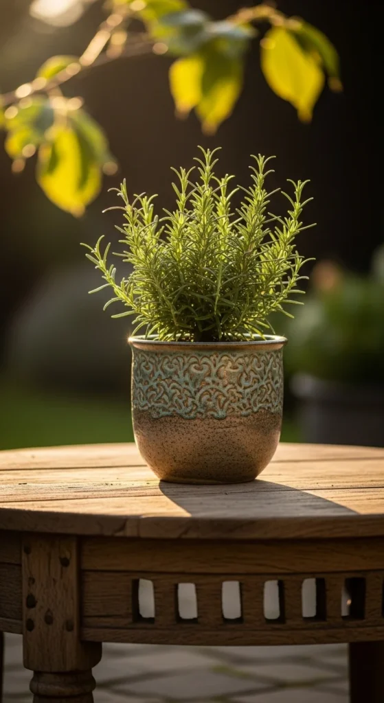 Place a small rosemary pot on an outdoor table to keep fragrance close. The plant stays tidy and doesn’t overwhelm small surfaces. Water lightly and rotate the pot weekly.