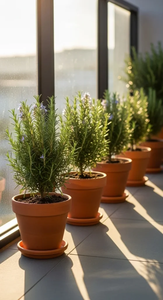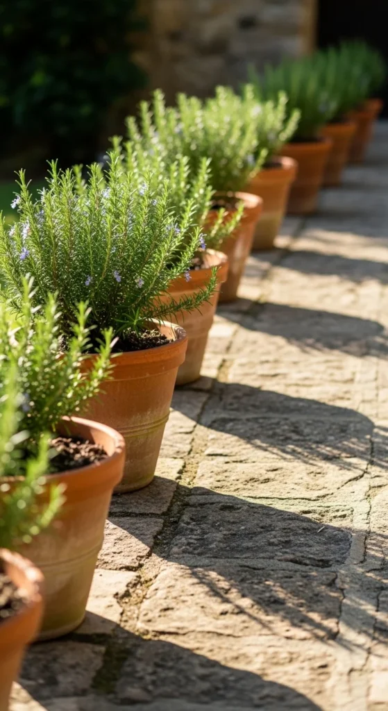 Use rosemary pots to mark pathways or step corners. The upright shape acts like natural markers. Keep pots spaced evenly and water only when soil feels dry on top.