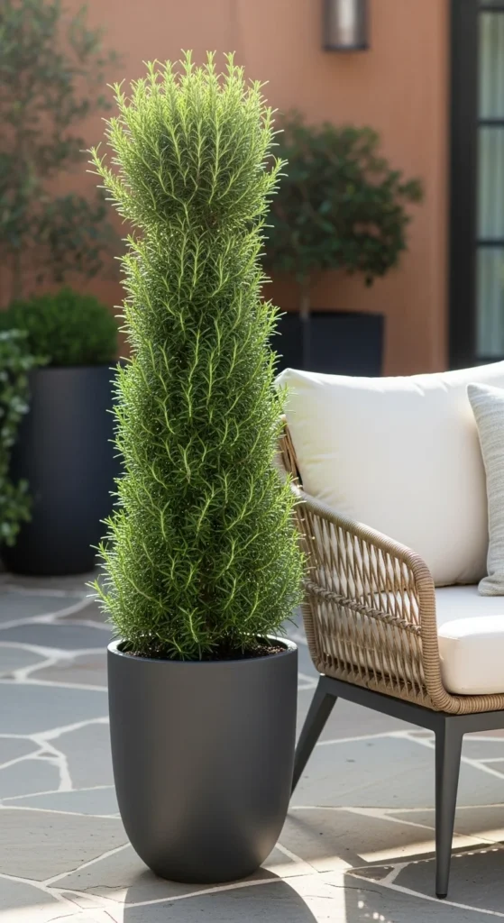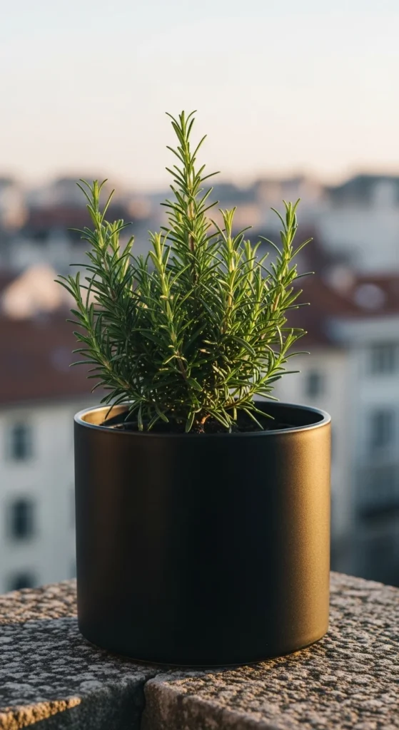 A black matte cylinder creates a sleek look. Rosemary’s green color contrasts nicely with dark container tones. Keep the pot on a bright balcony for best growth.