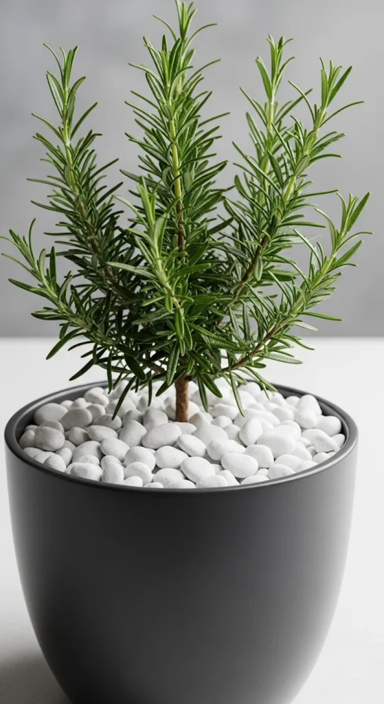 Cover soil with white pebbles to reflect light and keep the pot tidy. Rosemary stands out against the pale stones. This is great for modern patios.