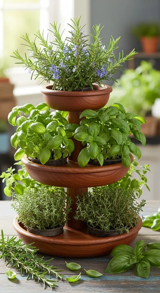 Place rosemary on a multi-tier stand with other herbs like thyme or sage. This keeps everything organized and easy to reach. Put rosemary on the top tier for sunlight.