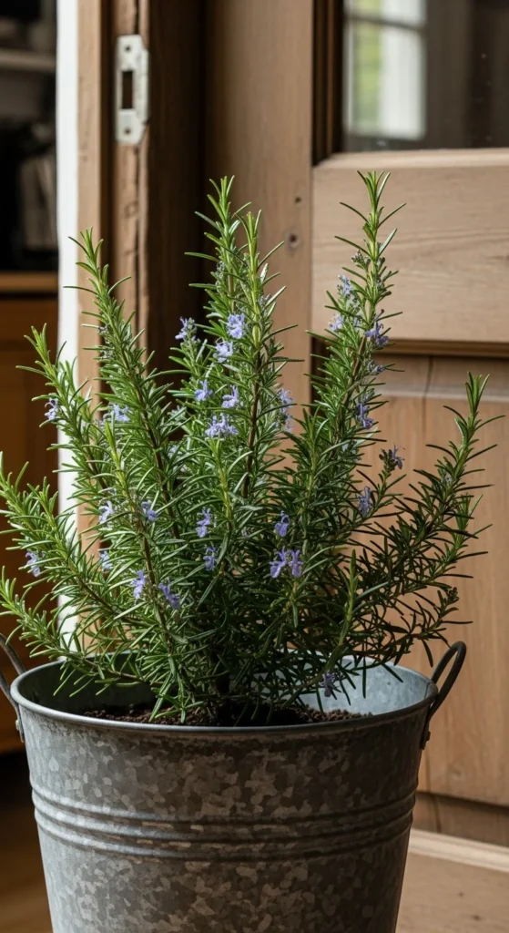 A metal bucket makes harvesting quick when placed near the kitchen door. Drill drainage holes if needed and use a light potting blend. Rosemary stays tidy, so even a small bucket works well. Keep it close to reach out and snip sprigs while cooking.