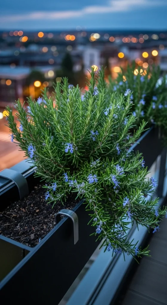 A rail planter helps rosemary catch extra sunlight and stays out of the way. The height makes trimming simple. Keep soil shallow but loose. Water lightly, especially in winter.