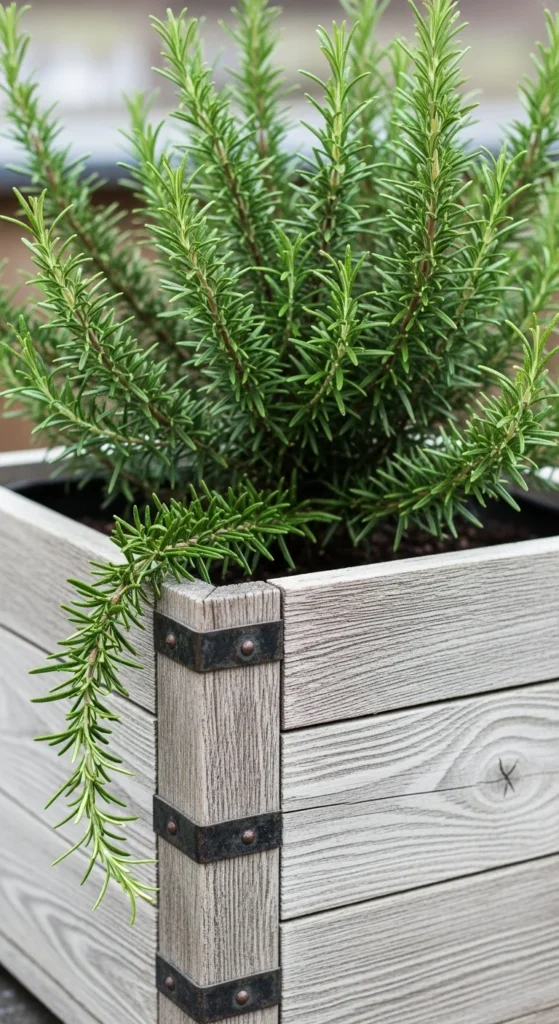 A wooden box gives a farmhouse-style touch. Rosemary grows well in wide, shallow boxes when the drainage is good. Add gravel at the bottom and fill the rest with light soil. Place the box near a window or balcony corner.