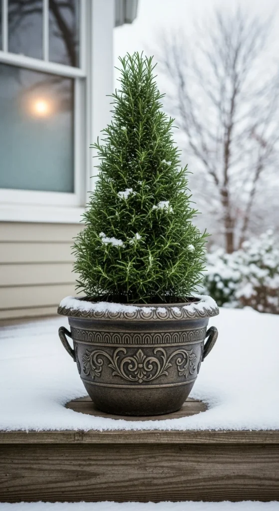 Trim rosemary into a cone to give your container a festive winter shape. Snip lightly along the outer edges and rotate the pot as you trim. Keep the center stems intact for strength. This works well for holiday displays or entryway decor.