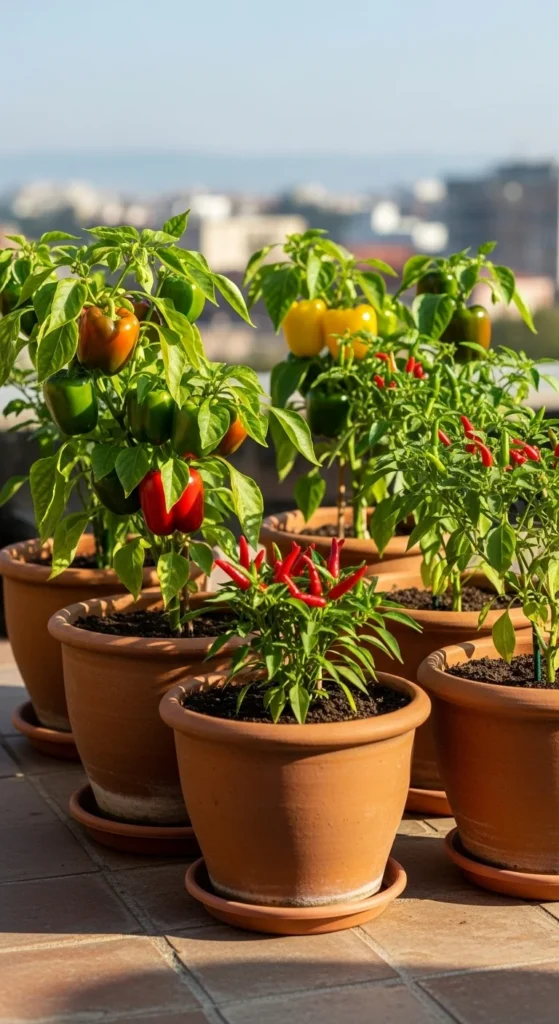 Clay pots keep roots cooler during hot spells. They’re great for chillies and capsicum because the soil dries evenly.