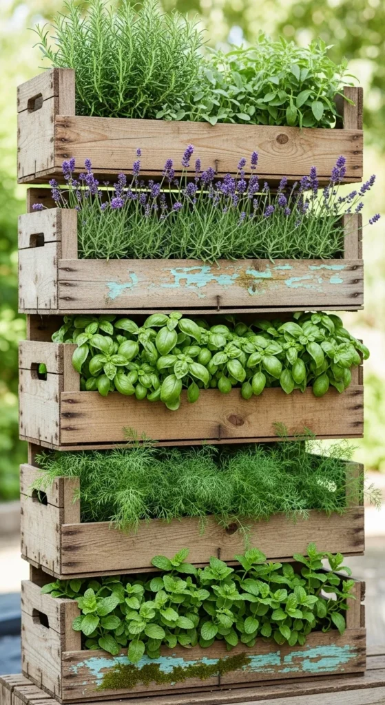 Stack crates securely using screws. Line each crate with burlap and fill with lightweight soil. Keep heavier crates at the bottom. A simple method is to use fruit crates from markets. Place the stack against a wall for stability. Use drip trays at the bottom to catch extra water.