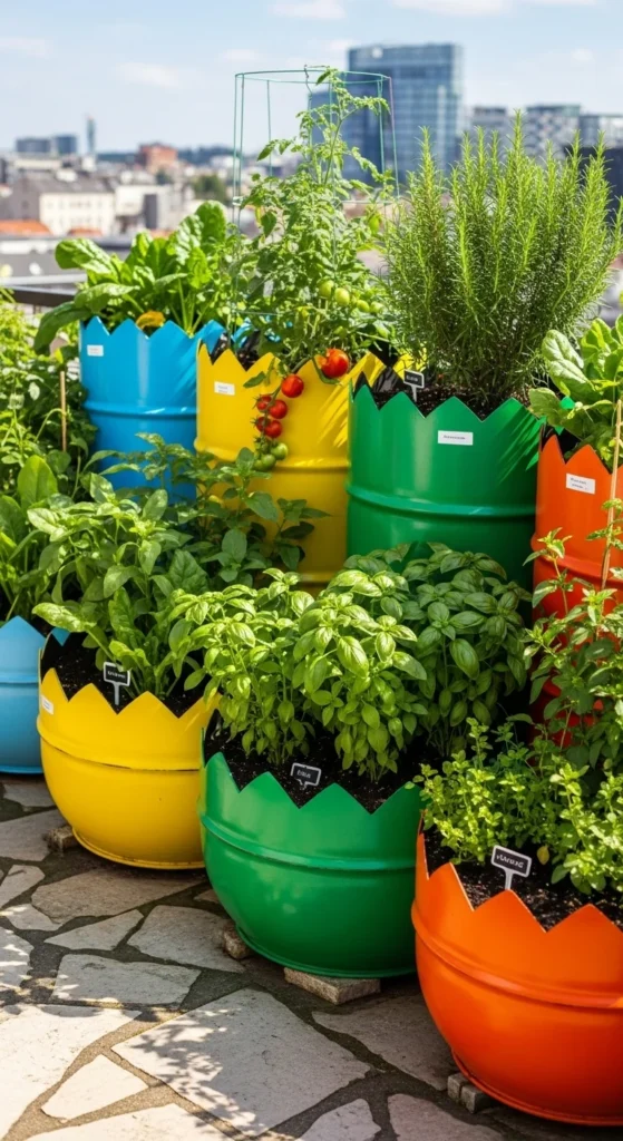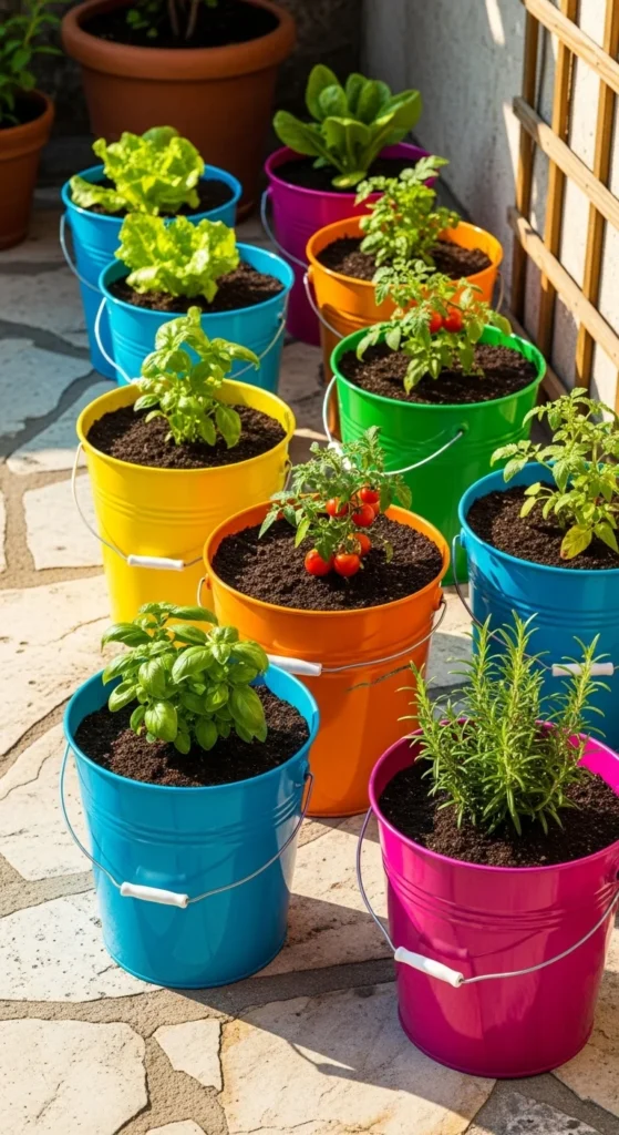 Clean buckets thoroughly and drill holes at the bottom. Paint them in bright colors to match the terrace. Fill with soil and compost. Place them along edges or stack two levels high using metal stands. This keeps the terrace tidy and gives compact planting space.