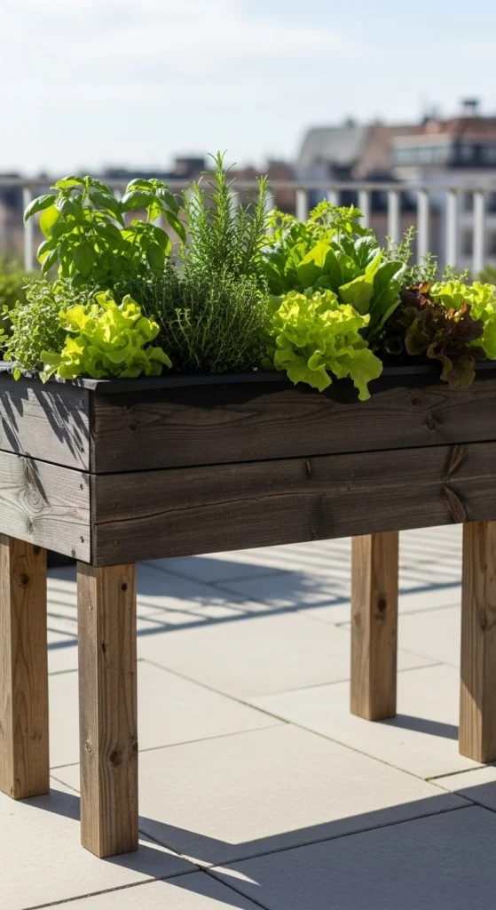 Hanging shelves fit into narrow terrace corners. They’re perfect for herbs, leafy greens, or dwarf veg.