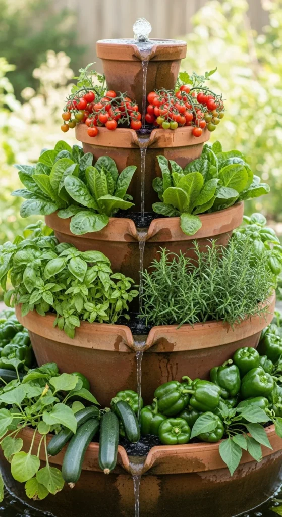 Stacked clay pots create a vertical planting surface. Each opening suits small greens or herbs.