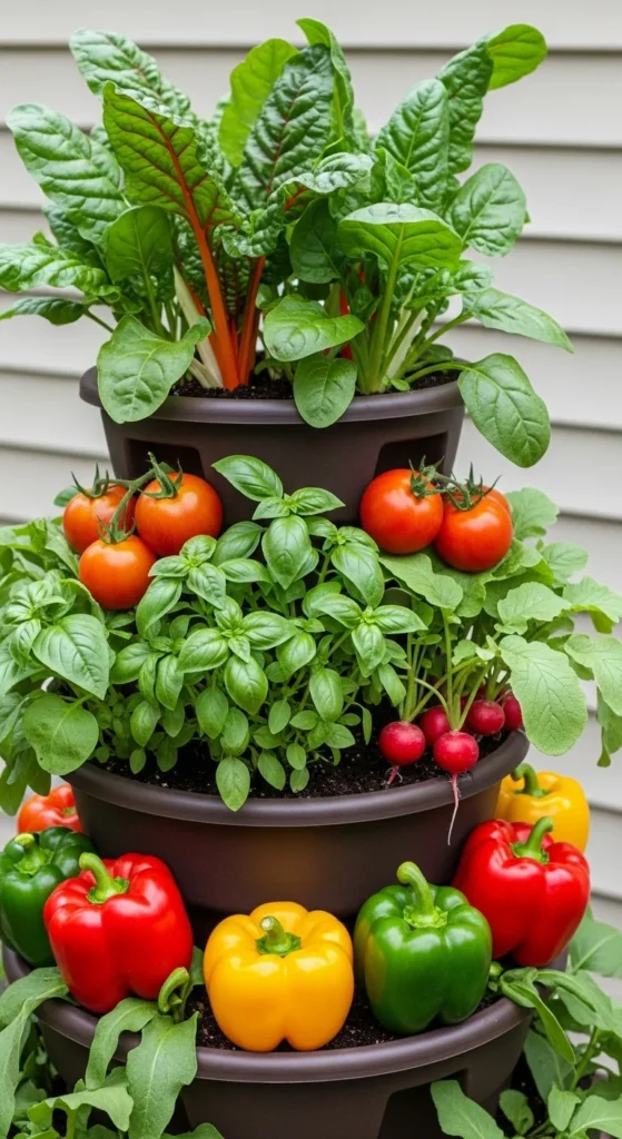 Stackable planters let you grow many vegetables in a compact column. They suit strawberries, basil, bok choy, and small peppers.
