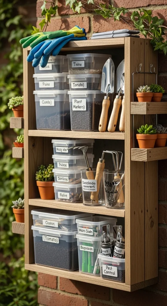 Sort through your storage shelf. Group similar tools together so you can find them easily. Place smaller items like seeds and labels in jars or boxes. Wipe dust from shelves and discard broken items. This helps keep your workspace clear for upcoming planting tasks.