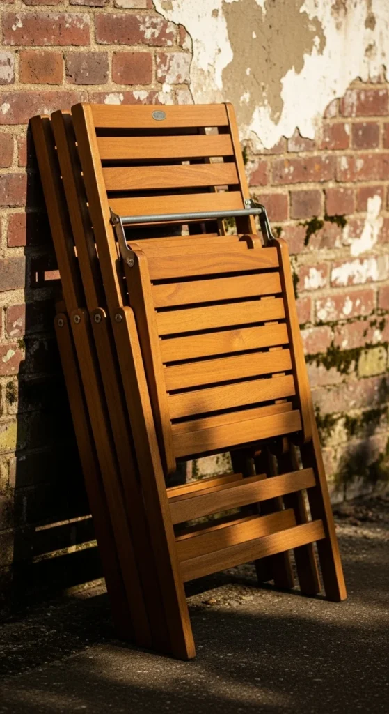 Fold chairs and stack them against a wall. Wipe them clean before storing. Move fragile items indoors. This frees up garden space and prevents damage during cold weather.