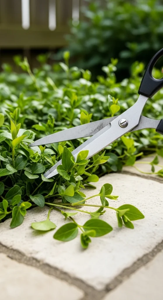 Cut back groundcover that spreads into walkways. Use scissors for small areas. Keep the edges neat to make the garden easier to move around. Add clippings to compost if they’re healthy.