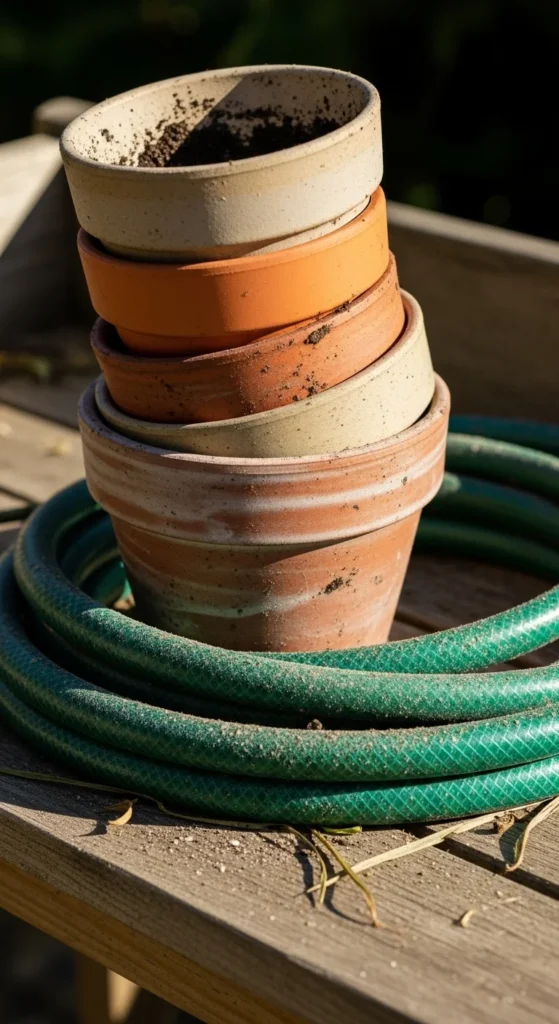Gather unused pots and rinse them clean. Remove old soil and scrub stubborn dirt with a brush. Let them dry before stacking. This keeps your storage area organized and ready for new planting. If a pot is cracked, repurpose it for drainage shards or small succulent planting.