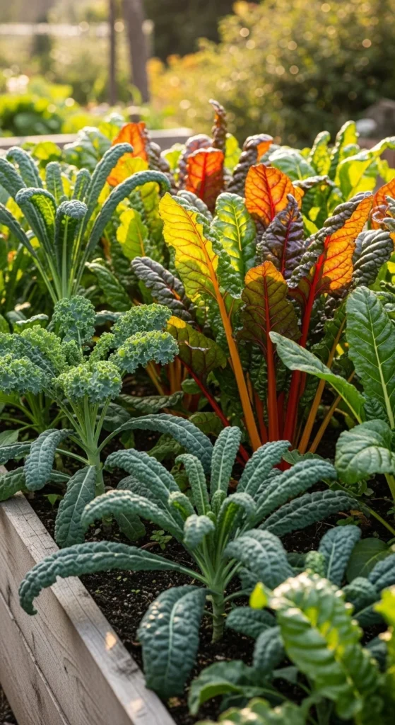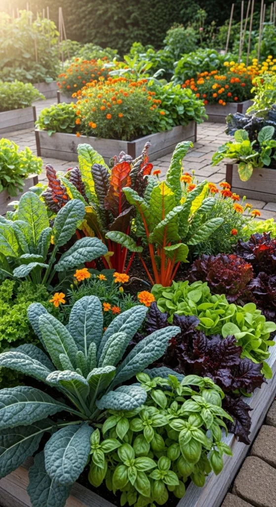 Pair kale and Swiss chard in one raised bed for a painterly mix of textures. Their colorful stems and leafy curls look decorative year-round. Use chard’s bright reds and yellows as visual anchors. Harvest outer leaves regularly to keep the center growing strong. A layer of compost and mulch helps them thrive in cooler months, making this bed both beautiful and practical for winter salads.