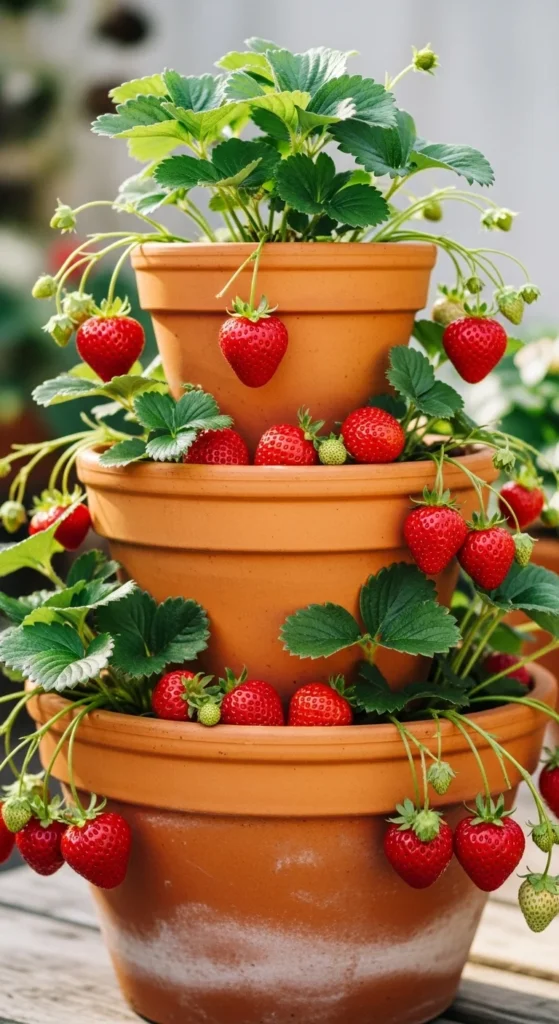 Stacked strawberry pots bring movement and form to small spaces. Their cascading leaves and red fruit catch the eye instantly. Place in sunny spots and water from the top so it trickles through all tiers. It’s a compact, decorative way to enjoy fresh berries even in tight patios.